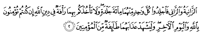 ![]() 24:1Hassanor Alapa : (giai) na Sūrah a initoron Ami skaniyan ago inipaliogat Ami skaniyan ago piakatoronan Ami sa manga tanda a manga rarayag ka kalokalo na makapananadm kano Muhsin Khan : (This is) a Surah (chapter of the Quran) which We have sent down and which We have enjoined, (ordained its legal laws) and in it We have revealed manifest Ayat (proofs, evidences, verses, lessons, signs, revelations lawful and unlawful things, and set boundries of Islamic Religion), that you may remember. Sahih International : [This is] a surah which We have sent down and made [that within it] obligatory and revealed therein verses of clear evidence that you might remember. Pickthall : (Here is) a surah which We have revealed and enjoined, and wherein We have revealed plain tokens, that haply ye may take heed. Yusuf Ali : A sura which We have sent down and which We have ordained in it have We sent down Clear Signs, in order that ye may receive admonition. Shakir : (This is) a chapter which We have revealed and made obligatory and in which We have revealed clear communications that you may be mindful. Dr. Ghali : A Surah that We have sent down and ordained; and We have sent down in it supremely evident signs that possibly you would be mindful. Tafsir Jalalayn : This is, a sūra which We have revealed and prescribed (read faradnāhā, or [the intensive form] farradnāhā, on account of the large number of prescriptions contained in it) and wherein We have revealed manifest signs, [signs] containing clear indications, that perhaps you might remember (tadhakkarūna: the second tā’ [of tatadhakkarūna] has been assimilated with the dhāl), that you might be admonished. Tagalog : Ang dakilang kabanatang ito ng Banal na Qur’ân ay Aming ipinahayag, at ipinag-utos Namin ang pagpapatupad ng batas nito, at ipinahayag Namin kalakip nito ang mga malilinaw na palatandaan; upang makaalaala kayo, O kayong mga mananampalataya, sa pamamagitan ng mga malilinaw na mga talatang ito at ipatutupad ninyo. ![]() 24:2Hassanor Alapa : So mizina a babay ago so mizina a mama na lphadi niyo so oman i isa kiran sa magatos a lphad 933 sa oba kano makowa sii kiran a kapdi (sa di niyo siran lphadan) sii ko Agama o Allāh amay ka miaadn kano a paparati-ayaan iyo so Allāh ago so alongan a maori, sa masai so kaziksaa kiran a dowa, a sagorompong a pd ko miamaratiaya. Muhsin Khan : The woman and the man guilty of illegal sexual intercourse, flog each of them with a hundred stripes. Let not pity withhold you in their case, in a punishment prescribed by Allah, if you believe in Allah and the Last Day. And let a party of the believers witness their punishment. (This punishment is for unmarried persons guilty of the above crime but if married persons commit it, the punishment is to stone them to death, according to Allah's Law). Sahih International : The [unmarried] woman or [unmarried] man found guilty of sexual intercourse - lash each one of them with a hundred lashes, and do not be taken by pity for them in the religion of Allah , if you should believe in Allah and the Last Day. And let a group of the believers witness their punishment. Pickthall : The adulterer and the adulteress, scourge ye each one of them (with) a hundred stripes. And let not pity for the twain withhold you from obedience to Allah, if ye believe in Allah and the Last Day. And let a party of believers witness their punishment. Yusuf Ali : The woman and the man guilty of adultery or fornication,- flog each of them with a hundred stripes: Let not compassion move you in their case, in a matter prescribed by Allah, if ye believe in Allah and the Last Day: and let a party of the Believers witness their punishment. Shakir : (As for) the fornicatress and the fornicator, flog each of them, (giving) a hundred stripes, and let not pity for them detain you in the matter of obedience to Allah, if you believe in Allah and the last day, and let a party of believers witness their chastisement. Dr. Ghali : The female fornicater and the male fornicator, (The Arabic Zaniyah and Zan refer to those who commit either fornication or adultery. By a comparison of this verse to other and to Hadiths., it is it is understood that this verse refers to fornicators, i.e., unmarried people committing illegal sexual intercourse) then lash each one of them a hundred lashes, and let not compassion for them (both) take (hold of) you in the religion of Allah, in case you believe in Allah and the Last Day; and let a section of the believers witness their (The torment of the two of them) torment. Tafsir Jalalayn : As for the fornicatress and the fornicator, that is, of those not in wedlock — because those [in wedlock] are stoned according to the Sunna (the al [in al-zāniya, ‘the fornicatress’, and al-zānī, ‘the fornicator’] according to some mentioned [opinions] is a relative [particle]; the clause [al-zāniyatu wa’l-zānī] is a subject, and because of its similarity to a conditional, the fā’ has been inserted into the predicate, which is [the following, fa’jlidū]): strike each of them a hundred lashes, [a hundred] strikes (one says jaladahu to mean daraba jildahu, ‘he struck him on the skin’). According to the Sunna, in addition to this [punishment] there is also banishment for a whole year. The slave, however, receives half of the mentioned [punishment]. And do not let any pity for them overcome you in God’s religion, that is to say, in [the fulfilment of] His rulings, by disregarding any part of their prescribed punishment, if you believe in God and the Last Day, namely, the Day of Resurrection: in this [statement] there is an incitement to [abide by] what was [mentioned] before the conditional [above] and it also constitutes the response to the latter, or [at least is] an indication of the response to it. And let their punishment, the flogging, be witnessed by a group of the believers — some say [that this should be a group of] three; some say four, as in the nu