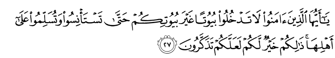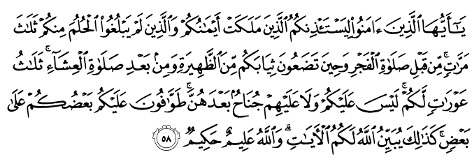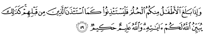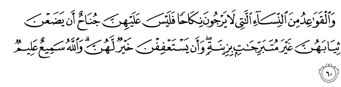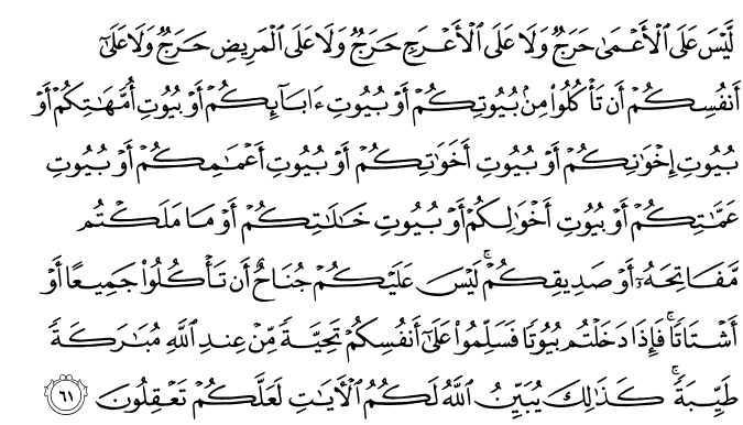 ![]() 24:59Hassanor Alapa : Na amay ka isampay so maroni rkano a manga wata sa kiabaligan na odas siran sa datar o kaphagodas o miaonaan iran (a manga ala a taw) datar oto a pphayagn rkano o Allāh so manga tanda iyan ka so Allāh na Matao a Maongangn Muhsin Khan : And when the children among you come to puberty, then let them (also) ask for permission, as those senior to them (in age). Thus Allah makes clear His Ayat (Commandments and legal obligations) for you. And Allah is All-Knowing, All-Wise. Sahih International : And when the children among you reach puberty, let them ask permission [at all times] as those before them have done. Thus does Allah make clear to you His verses; and Allah is Knowing and Wise. Pickthall : And when the children among you come to puberty then let them ask leave even as those before them used to ask it. Thus Allah maketh clear His revelations for you. Allah is Knower, Wise. Yusuf Ali : But when the children among you come of age, let them (also) ask for permission, as do those senior to them (in age): Thus does Allah make clear His Signs to you: for Allah is full of knowledge and wisdom. Shakir : And when the children among you have attained to puberty, let them seek permission as those before them sought permission; thus does Allah make clear to you His communications, and Allah is knowing, Wise. Dr. Ghali : And when the young children among you reach puberty, then let them ask permission as the ones even before them asked permission. Thus Allah makes evident to you His signs, and Allah is Ever-Knowing, Ever-Wise. Tafsir Jalalayn : And when the children among you, O free men, reach puberty, let them seek permission, at all times, just as those, [now] older free men, sought permission before them. So God clarifies His signs for you, and God is Knower, Wise. Tagalog : At kapag umabot na ang mga kabataan sa hustong gulang na sila ay inuutusan na sumunod sa mga alintuntunin ng Islâm, kinakailangang sila ay humingi ng pahintulot kapag sila ay pumasok sa inyo sa lahat ng pagkakataon na katulad ng paghingi ng pahintulot ng mga matatanda, at kung paano nilinaw ng Allâh ang pag-uugali hinggil sa pagpapaalam ay nilinaw din Niya sa inyo ang Kanyang mga talata. At ang Allâh ay ‘`Aleem’ – Ganap na Nakaaalam sa kung ano ang ikabubuti ng Kanyang mga alipin, na ‘Hakeem’ – Ganap na Maalam sa Kanyang panukala. ![]() 24:60Hassanor Alapa : Go so miamakatoa a manga babay a di ran aarapn so kapangaroma na da a dosa iran a kibtadn iran ko nditarn iran a di siran mbibinayar sa parahiasan, na amay ka phindiara siran na aya kiran mapia ka so Allāh na pphakan’g a Matao Muhsin Khan : And as for women past child-bearing who do not expect wed-lock, it is no sin on them if they discard their (outer) clothing in such a way as not to show their adornment. But to refrain (i.e. not to discard their outer clothing) is better for them. And Allah is All-Hearer, All-Knower. Sahih International : And women of post-menstrual age who have no desire for marriage - there is no blame upon them for putting aside their outer garments [but] not displaying adornment. But to modestly refrain [from that] is better for them. And Allah is Hearing and Knowing. Pickthall : As for women past child-bearing, who have no hope of marriage, it is no sin for them if they discard their (outer) clothing in such a way as not to show adornment. But to refrain is better for them. Allah is Hearer, Knower. Yusuf Ali : Such elderly women as are past the prospect of marriage,- there is no blame on them if they lay aside their (outer) garments, provided they make not a wanton display of their beauty: but it is best for them to be modest: and Allah is One Who sees and knows all things. Shakir : And (as for) women advanced in years who do not hope for a marriage, it is no sin for them if they put off their clothes without displaying their ornaments; and if they restrain themselves it is better for them; and Allah is Hearing, Knowing. Dr. Ghali : And women sitting (advanced in years) who do not hope being married, then it is no fault in them that they lay aside their (outer) clothes, without flaunting their adornment; and to keep abstaining is more charitable for them, and Allah is Ever-Hearing, Ever-Knowing. Tafsir Jalalayn : And as for menopausal women, who have ceased to menstruate or to bear children because of old age, who do not expect to marry, for that reason, they would not be at fault if they put off their clothes, such a robe, a cloak, or the facial mask over a head veil, in such a way as not to display adornment, that is hidden, such as a necklace, a bracelet or an anklet; but to refrain [from doing so], by not putting them off, is better for them; and God is Hearer, of what you say, Knower, of what is in your hearts. Tagalog : At ang mga matatandang kababaihan na hindi na nangangailangan ng anumang pagnanasa dahil sa kanilang katandaan, at wala na silang hilig sa mga kalalakihan upang mapangasawa, at wala na ring pagnanasa sa kanila ang mga kalalakihan, sa katulad nila ay hindi na kasalanan na alisin ang anumang damit na ipinapatong sa kanilang kasuotan na hindi naman nila inilalantad ang kanilang mga kagandahan, magkagayunpaman ang pagsuot nila ng ganitong kasuotan upang pantakip at maging malayo sa anumang hindi kanais-nais ay higit na nakabubuti sa kanila. At ang Allâh ay ‘Samee`’ – Ganap na Nakaririnig sa anuman na kanilang sinasabi, na ‘`Aleem’ – Ganap na Nakaaalam sa kanilang layunin at mga gawain. ![]() 24:61Hassanor Alapa : Daa patoray ko bota a dosa go da pn ko timpang ago so pkhasakit i dosa, go da pn ko manga ginawa niyo a kakan iyo ko 959 manga walay niyo, odi na manga walay o manga ama iyo, odi na manga walay o manga ina iyo, odi na manga walay o manga pagari niyo a manga mama, odi na manga walay o manga babay niyo, odi na manga walay o manga bapa iyo ko ama iyo, odi na manga walay o manga babo iyo ko ama iyo, odi na manga walay o manga bapa iyo ko ina iyo, odi na manga wa
