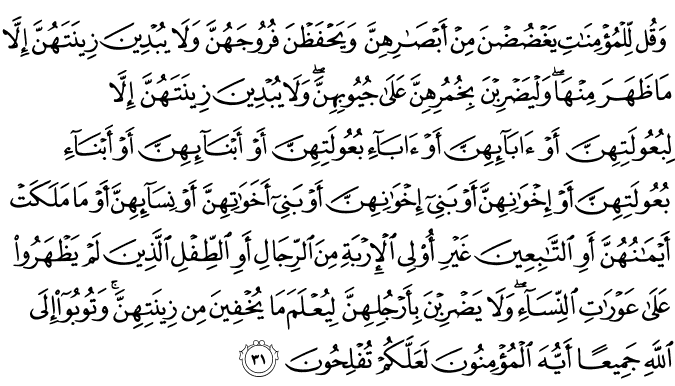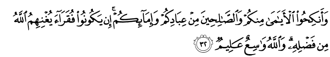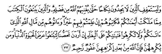 ![]() 24:32Hassanor Alapa : Go pakipama-ngaromaan iyo so manga babay rkano ago so manga pipia a pd ko manga oripn iyo, a mama ago babay ka amay ka maadn siran a manga mrmr na pakakhawasaan siran o Allāh ko pd ko kalbihan Iyan, go so Allāh na Makaankos a lbi a Matao Muhsin Khan : And marry those among you who are single (i.e. a man who has no wife and the woman who has no husband) and (also marry) the Salihun (pious, fit and capable ones) of your (male) slaves and maid-servants (female slaves). If they be poor, Allah will enrich them out of His Bounty. And Allah is All-Sufficent for His creatures' needs, All-Knowing (about the state of the people). Sahih International : And marry the unmarried among you and the righteous among your male slaves and female slaves. If they should be poor, Allah will enrich them from His bounty, and Allah is all-Encompassing and Knowing. Pickthall : And marry such of you as are solitary and the pious of your slaves and maid-servants. If they be poor, Allah will enrich them of His bounty. Allah is of ample means, Aware. Yusuf Ali : Marry those among you who are single, or the virtuous ones among yourselves, male or female: if they are in poverty, Allah will give them means out of His grace: for Allah encompasseth all, and he knoweth all things. Shakir : And marry those among you who are single and those who are fit among your male slaves and your female slaves; if they are needy, Allah will make them free from want out of His grace; and Allah is Ample-giving, Knowing. Dr. Ghali : And wed the spouseless among you, and the righteous among your bondmen and maids. In case they are poor, Allah will enrich them of His Grace; and Allah is Ever- Embracing, Ever-Knowing. Tafsir Jalalayn : And marry off the spouseless among you (ayāmā is the plural form of ayyim, namely, a spouseless female, whether she be a virgin or one previously married, or a spouseless male), this [stipulation] relates to free men and free women, and the righteous ones, the believers, among your male slaves and your female slaves (‘ibād is one plural form of ‘abd). If they, the free men, are poor, God will enrich them, through marriage, out of His bounty. God is Embracing, of [the needs of] His creatures, Knowing, of them. Tagalog : At hanapan ninyo ng mga mapapangasawa, O kayong mga mananampalataya, ang sinuman na walang asawa na mga malalaya na mga kalalakihan at mga kababaihan at mga mabubuti na sila ay mula sa inyong mga alipin ng mga kalalakihan at alipin na mga kababaihan, at kung sinuman ang nagnais na mag-asawa upang pangalagaan ang kanyang sarili na siya ay mahirap ay pagyayamin siya ng Allâh mula sa Kanyang masaganang kabuhayan. At ang Allâh ay masagana ang Kanyang Kabutihan at dakila ang Kanyang Kagandahang-Loob, na higit na Nakaaalam sa kalagayan ng Kanyang mga alipin. ![]() 24:33Hassanor Alapa : Sa phindiara so siran oto a da a khatoon iran a tamok a miphangaroma iran, sa taman sa bgan siran o Allāh sa pd ko kalbihan Iyan, go so siran oto a phangnin iran so 946 kasoratan (ko kapakamaradika) a pd ko manga oripn iyo, na bgi niyo siran sa kasoratan amay ka adn a matoon iyo kiran a mapia, go bgi niyo siran sa pd ko tamok o Allāh a so inibgay Niyan rkano (sa mibayad iran ko kamaradika iran), go o ba niyo tgla so manga oripn iyo a manga babay ko kazina amay ka mabaya siran sa kapindiara, 947 sa pthontotn iyo so kakayaan ko kaoyagoyag ko doniya, na sa taw a tomgl kiran na mataan a so Allāh ko oriyan o kiatgl iran na Paririla a Masalinggagawn Muhsin Khan : And let those who find not the financial means for marriage keep themselves chaste, until Allah enriches them of His Bounty. And such of your slaves as seek a writing (of emancipation), give them such writing, if you know that they are good and trustworthy. And give them something yourselves out of the wealth of Allah which He has bestowed upon you. And force not your maids to prostitution, if they desire chastity, in order that you may make a gain in the (perishable) goods of this worldly life. But if anyone compels them (to prostitution), then after such compulsion, Allah is Oft-Forgiving, Most Merciful (to those women, i.e. He will forgive them because they have been forced to do this evil action unwillingly). Sahih International : But let them who find not [the means for] marriage abstain [from sexual relations] until Allah enriches them from His bounty. And those who seek a contract [for eventual emancipation] from among whom your right hands possess - then make a contract with them if you know there is within them goodness and give them from the wealth of Allah which He has given you. And do not compel your slave girls to prostitution, if they desire chastity, to seek [thereby] the temporary interests of worldly life. And if someone should compel them, then indeed, Allah is [to them], after their compulsion, Forgiving and Merciful. Pickthall : And let those who cannot find a match keep chaste till Allah give them independence by His grace. And such of your slaves as seek a writing (of emancipation), write it for them if ye are aware of aught of good in them, and bestow upon them of the wealth of Allah which He hath bestowed upon you. Force not your slave-girls to whoredom that ye may seek enjoyment of the life of the world, if they would preserve their chastity. And if one force them, then (unto them), after their compulsion, lo! Allah will be Forgiving, Merciful. Yusuf Ali : Let those who find not the wherewithal for marriage keep themselves chaste, until Allah gives them means out of His grace. And if any of your slaves ask for a deed in writing (to enable them to earn their freedom for a certain sum), give them such a deed if ye know any good in them: yea, give them something yourselves out of the means which Allah has given to you. But force not your maids to prostitution when they desire chastity, in order that ye may make a gain in the goods of this life. But if anyone compels them, yet, after such compulsion, is Al