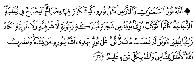 ![]() 24:34Hassanor Alapa : Go sabnar a piakatoronan Ami skano sa manga tanda a manga rarayag ago ibarat a phoon ko siran oto a miaipos ko miaonaan iyo ago thoma a rk o miamananggila Muhsin Khan : And indeed We have sent down for you Ayat (proofs, evidences, verses, lessons, signs, revelations, etc.) that make things plain, and the example of those who passed away before you, and an admonition for those who are Al-Muttaqun (the pious - see V.2:2). Sahih International : And We have certainly sent down to you distinct verses and examples from those who passed on before you and an admonition for those who fear Allah . Pickthall : And verily We have sent down for you revelations that make plain, and the example of those who passed away before you. An admonition unto those who ward off (evil). Yusuf Ali : We have already sent down to you verses making things clear, an illustration from (the story of) people who passed away before you, and an admonition for those who fear (Allah). Shakir : And certainly We have sent to you clear communications and a description of those who have passed away before you, and an admonition to those who guard (against evil). Dr. Ghali : And indeed We have already sent down to you demonstrably evident signs, and a similitude of the ones who passed away even before you, and an admonition for the pious. Tafsir Jalalayn : And verily We have revealed to you clear verses (read mubayyanāt or mubayyināt), in this sūra, [verses] in which [if read mubayyanāt] what is mentioned is [already] clear, or which [if read mubayyināt] are clarificatory of [that which is mentioned], and an example, a curious tale, namely, that of ‘Ā’isha, of those who passed away before you, that is to say, of their kind of example, that is, [an example] of their curious tales, such as the tales of Joseph and Mary, and an admonition for those who fear God, in what He, exalted be He, has said: And do not let any pity for them overcome you in God’s religion [verse 2, above]; and, Why, when you [first] heard about it, did the believing men [and women] not think [good of themselves]… to the end [of verse 12, above]; and, And why, when you heard it, did you not say … to the end [of verse 16, above]; and, God admonishes you lest you should ever repeat [the like of it] … to the end [of verse 17, above]. This [admonition] is specifically for ‘those who fear God’ because they are the ones to benefit from such [an admonition]. Tagalog : At katiyakan, ibinaba Namin sa inyo ang kapahayagan, O kayong mga tao, na mga talata ng Banal na Qur’ân na mga malilinaw na katibayan ng katotohanan, at halimbawa mula sa kuwento ng mga naunang tao, at pagpapayo sa sinumang nakauunawa nito na natatakot sa Allâh at nag-iingat mula sa Kanyang kaparusahan. ![]() 24:35Hassanor Alapa : So Allāh i sindaw (tihaya) o manga langit ago so lopa, a aya ibarat o tihaya Niyan na datar o korom a adn a palitaan on a so palitaan na madadalm sa katiya a so katiya na datar skaniyan o bitoon a masigay a ttntman (ko lana) a kayo a pakambabarakatn a zaytūn 948 a (di matatampar) sa sbangan ago di pn sa sdpan (ko kapamomolaa on sa di katatanongan) a maito bo na so lana niyan na khadg apia pn da katntmi sa apoy. Sindaw (tihaya) 949 a maliliawaw sa sindaw, thoroon o Allāh ko sindaw Niyan so taw a khabayaan Iyan go pmbgay so Allāh sa manga ibarat ko manga taw, so Allāh ko kalangowan a sahyi na Gomgpa Muhsin Khan : Allah is the Light of the heavens and the earth. The parable of His Light is as (if there were) a niche and within it a lamp, the lamp is in glass, the glass as it were a brilliant star, lit from a blessed tree, an olive, neither of the east (i.e. neither it gets sun-rays only in the morning) nor of the west (i.e. nor it gets sun-rays only in the afternoon, but it is exposed to the sun all day long), whose oil would almost glow forth (of itself), though no fire touched it. Light upon Light! Allah guides to His Light whom He wills. And Allah sets forth parables for mankind, and Allah is All-Knower of everything. Sahih International : Allah is the Light of the heavens and the earth. The example of His light is like a niche within which is a lamp, the lamp is within glass, the glass as if it were a pearly [white] star lit from [the oil of] a blessed olive tree, neither of the east nor of the west, whose oil would almost glow even if untouched by fire. Light upon light. Allah guides to His light whom He wills. And Allah presents examples for the people, and Allah is Knowing of all things. Pickthall : Allah is the Light of the heavens and the earth. The similitude of His light is as a niche wherein is a lamp. The lamp is in a glass. The glass is as it were a shining star. (This lamp is) kindled from a blessed tree, an olive neither of the East nor of the West, whose oil would almost glow forth (of itself) though no fire touched it. Light upon light. Allah guideth unto His light whom He will. And Allah speaketh to mankind in allegories, for Allah is Knower of all things. Yusuf Ali : Allah is the Light of the heavens and the earth. The Parable of His Light is as if there were a Niche and within it a Lamp: the Lamp enclosed in Glass: the glass as it were a brilliant star: Lit from a blessed Tree, an Olive, neither of the east nor of the west, whose oil is well-nigh luminous, though fire scarce touched it: Light upon Light! Allah doth guide whom He will to His Light: Allah doth set forth Parables for men: and Allah doth know all things. Shakir : Allah is the light of the heavens and the earth; a likeness of His light is as a niche in which is a lamp, the lamp is in a glass, (and) the glass is as it were a brightly shining star, lit from a blessed olive-tree, neither eastern nor western, the oil whereof almost gives light though fire touch it not-- light upon light-- Allah guides to His light whom He pleases, and Allah sets forth parables for men, and Allah is Cognizant of all things. Dr. Ghali : Allah is The Light of the h