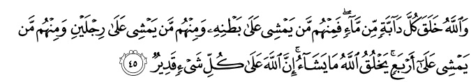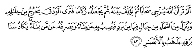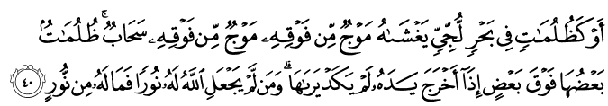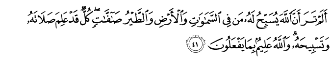 ![]() 24:40Hassanor Alapa : Odi na so (kada-dadag o Kafir) na datar a manga 953 knm sa kalodan a madalm a kokolambowan a bagl a kaliliawawan sa bagl a kaliliawawan sa gabon a manga knm a so sabaad on na maliliawaw ko sabagi on a o kayawn iyan a lima niyan na di niyan mailay (ko kalibotng o knm) na sa taw a di bgan o Allāh sa sindaw na da dn a makowa niyan a mlk bo a sindaw. Muhsin Khan : Or [the state of a disbeliever] is like the darkness in a vast deep sea, overwhelmed with a great wave topped by a great wave, topped by dark clouds, darkness, one above another, if a man stretches out his hand, he can hardly see it! And he for whom Allah has not appointed light, for him there is no light. Sahih International : Or [they are] like darknesses within an unfathomable sea which is covered by waves, upon which are waves, over which are clouds - darknesses, some of them upon others. When one puts out his hand [therein], he can hardly see it. And he to whom Allah has not granted light - for him there is no light. Pickthall : Or as darkness on a vast, abysmal sea. There covereth him a wave, above which is a wave, above which is a cloud. Layer upon layer of darkness. When he holdeth out his hand he scarce can see it. And he for whom Allah hath not appointed light, for him there is no light. Yusuf Ali : Or (the Unbelievers' state) is like the depths of darkness in a vast deep ocean, overwhelmed with billow topped by billow, topped by (dark) clouds: depths of darkness, one above another: if a man stretches out his hands, he can hardly see it! for any to whom Allah giveth not light, there is no light! Shakir : Or like utter darkness in the deep sea: there covers it a wave above which is another wave, above which is a cloud, (layers of) utter darkness one above another; when he holds out his hand, he is almost unable to see it; and to whomsoever Allah does not give light, he has no light. Dr. Ghali : Or (they are) as darkness (es) in a tumultuous sea (vast and deep) enveloped by waves above which are waves, upon which are clouds: darknesses above each other, (Some of them "are" above some "others") when he brings out his hand, he could almost not see it. And for whomever Allah makes no light, then in no way (can) he have light. Tafsir Jalalayn : Or, [it is that] those who disbelieve, their evil deeds are, as the manifold darkness on a deep sea, covered by a billow, above which, that is, [above which] billow, there is [another] billow, above which, second billow, there are clouds, these being the, manifold [layers of] darkness, one on top of another, the darkness of the sea, the darkness of the first billow, the darkness of the second together with the darkness of the clouds. When he, an observer, holds out his hand, in such layers of darkness, he can scarcely see it, in other words, he would not [even] come close to seeing it. And he whom God has not granted any light has no light, that is to say, he whom God does not guide cannot be guided. Tagalog : O di kaya, ang kanilang mga gawain ay magiging katulad ng mga kadiliman sa ilalim ng malalim na karagatan na ang nasa ibabaw nito ay alon, na ang alon na ito ay napangingibabawang muli ng panibagong mga alon, at nasa ibabaw nito ang mga makapal na ulap, na matitinding kadiliman na magkakapatung-patong sa isa’t-isa, kung sakali na ang isang tao na nasa ganoong kalagayan, na kapag iniunat niya ang kanyang kamay ay talagang hindi niya ito maaninag sa tindi ng kadiliman, na kung kaya, ang mga walang pananampalataya ay nagkakapatung-patong na sa kanila ang mga kadiliman ng pagsamba ng iba, pagkaligaw at mga masasamang gawain. At ang sinumang hindi pagkalooban ng Allâh ng liwanag mula sa Kanyang Aklat at sa ‘Sunnah’ ng Kanyang Propeta (saw) na igagabay sa kanya ay wala na siyang anupamang patnubay. ![]() 24:41Hassanor Alapa : Ba nka da mailay a so Allāh na pthasbih on so madadalm ko manga langit ago so lopa. ago so papanok na kakayatn iyan so papak iyan sa langon dn oto na katawan iyan so sambayang iyan (simba niyan) ago so tasbih iyan, go so Allāh na katawan Iyan so nganin a gii ran nggalbkn Muhsin Khan : See you not (O Muhammad SAW) that Allah, He it is Whom glorify whosoever is in the heavens and the earth, and the birds with wings out-spread (in their flight). Of each one He (Allah) knows indeed his Salat (prayer) and his glorification, [or everyone knows his Salat (prayer) and his glorification], and Allah is All-Aware of what they do. Sahih International : Do you not see that Allah is exalted by whomever is within the heavens and the earth and [by] the birds with wings spread [in flight]? Each [of them] has known his [means of] prayer and exalting [Him], and Allah is Knowing of what they do. Pickthall : Hast thou not seen that Allah, He it is Whom all who are in the heavens and the earth praise, and the birds in their flight? Of each He knoweth verily the worship and the praise; and Allah is Aware of what they do. Yusuf Ali : Seest thou not that it is Allah Whose praises all beings in the heavens and on earth do celebrate, and the birds (of the air) with wings outspread? Each one knows its own (mode of) prayer and praise. And Allah knows well all that they do. Shakir : Do you not see that Allah is He Whom do glorify all those who are in the heavens and the earth, and the (very) birds with expanded wings? He knows the prayer of each one and its glorification, and Allah is Cognizant of what they do. Dr. Ghali : Have you not seen that to Allah extol whoever are in the heavens and the earth and the birds outstretching (their wings)? (Or: in ranks) Each has already known its prayer and its Extolment; and Allah is Ever-Knowing of whatever they perform. Tafsir Jalalayn : Have you not seen that God is glorified by all who are in the heavens and the earth, prayer being one form of glorification, and the birds (tayr is the plural of tā’ir), between the heaven and the earth, spreading their wings? (sāffātin is a circumstantial qualifier). Of each [on