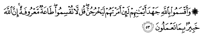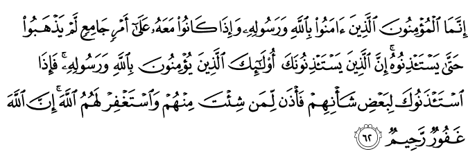 ![]() 24:62Hassanor Alapa : Mataan a so miamaratiaya a siran oto so piaratiaya iran so Allāh ago so sogo’ Iyan na igira miaadn siran a pd iran (so Rasūl) sa btad a mapnd na di siran mlalakaw taman sa di siran makaodas 961 ko Rasūl, na so siran oto a phagodas siran rka na siran oto so paparatiayaan iran so Allāh ago so sogo’ Iyan na amay ka modas siran rka ko sabaad a btad iran na idin inka so khabayaan ka a pd kiran ago pamangnin ka siran sa rila ko Allāh, ka mataan a so Allāh na Paririla a Masalinggagawn. Muhsin Khan : The true believers are only those, who believe in (the Oneness of) Allah and His Messenger (Muhammad SAW), and when they are with him on some common matter, they go not away until they have asked his permission. Verily! Those who ask your permission, those are they who (really) believe in Allah and His Messenger. So if they ask your permission for some affairs of theirs, give permission to whom you will of them, and ask Allah for their forgiveness. Truly, Allah is Oft-Forgiving, Most Merciful. Sahih International : The believers are only those who believe in Allah and His Messenger and, when they are [meeting] with him for a matter of common interest, do not depart until they have asked his permission. Indeed, those who ask your permission, [O Muhammad] - those are the ones who believe in Allah and His Messenger. So when they ask your permission for something of their affairs, then give permission to whom you will among them and ask forgiveness for them of Allah . Indeed, Allah is Forgiving and Merciful. Pickthall : They only are the true believers who believe in Allah and His messenger and, when they are with him on some common errand, go not away until they have asked leave of him. Lo! those who ask leave of thee, those are they who believe in Allah and His messenger. So, if they ask thy leave for some affair of theirs, give leave to whom thou wilt of them, and ask for them forgiveness of Allah. Lo! Allah is Forgiving, Merciful. Yusuf Ali : Only those are believers, who believe in Allah and His Messenger: when they are with him on a matter requiring collective action, they do not depart until they have asked for his leave; those who ask for thy leave are those who believe in Allah and His Messenger; so when they ask for thy leave, for some business of theirs, give leave to those of them whom thou wilt, and ask Allah for their forgiveness: for Allah is Oft-Forgiving, Most Merciful. Shakir : Only those are believers who believe in Allah and His Messenger, and when they are with him on a momentous affair they go not away until they have asked his permission; surely they who ask your permission are they who believe in Allah and His Messenger; so when they ask your permission for some affair of theirs, give permission to whom you please of them and ask forgiveness for them from Allah; surely Allah is Forgiving, Merciful. Dr. Ghali : Surely they only are the believers who have believed in Allah and His Messenger and who, when they are with him upon a common Command, do not go away until they ask his permission. Surely the ones who ask your permission are those who believe in Allah and His Messenger. So when they ask your permission for some affair of their own, then give permission to whom you decide of them, and ask for them the forgiveness of Allah; surely Allah is Ever-Forgiving, Ever-Merciful. Tafsir Jalalayn : Only they are believers who believe in God and His Messenger and who, when they are with him, namely, the Messenger, in a collective affair, such as [during] the Friday sermon, do not leave, when they have an excuse, until they have asked leave of him. Truly those who ask leave of you — it is they who believe in God and His Messenger. So when they ask leave of you for some affair, [some] matter, of theirs, give permission to whom you will of them, to leave, and ask God to forgive them. Truly God is Forgiving, Merciful. Tagalog : Katiyakan, ang tunay na mga mananampalataya ay yaong mga naniwala sa Allâh at sa Kanyang Sugo, at ipinatupad ang Kanyang batas, at kapag kasama nila ang Propeta (saw), na sila ay nagsasama-sama dahil sa kapakanan ng mga Muslim, ay hindi aalis ang sinuman sa kanila hangga’t hindi siya makapagpaalam sa kanya (Propeta).