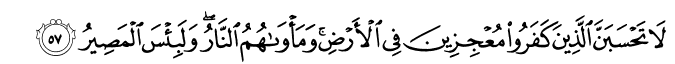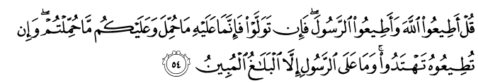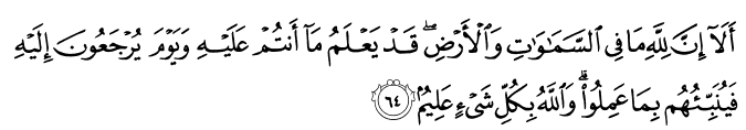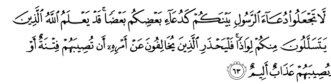 ![]() 24:63Hassanor Alapa : Oba niyo baloya so kapthalowi ko Rasūl ko ltlt iyo a datar o kapthalowi o sabaad rkano 962 ko sabagi, sabnar a katawan o Allāh so siran oto a gii siran zolnsoln sa pagns (sa phliyo siran a di siran magodas) panaggilai o siran oto a pzopakn (phagrnn) iran so sogoan iyan a kasogata kiran a morka odi na masogat siran a siksa a masakit Muhsin Khan : Make not the calling of the Messenger (Muhammad SAW) among you as your calling of one another. Allah knows those of you who slip away under shelter (of some excuse without taking the permission to leave, from the Messenger SAW). And let those who oppose the Messenger's (Muhammad SAW) commandment (i.e. his Sunnah legal ways, orders, acts of worship, statements, etc.) (among the sects) beware, lest some Fitnah (disbelief, trials, afflictions, earthquakes, killing, overpowered by a tyrant, etc.) befall them or a painful torment be inflicted on them. Sahih International : Do not make [your] calling of the Messenger among yourselves as the call of one of you to another. Already Allah knows those of you who slip away, concealed by others. So let those beware who dissent from the Prophet's order, lest fitnah strike them or a painful punishment. Pickthall : Make not the calling of the messenger among you as your calling one of another. Allah knoweth those of you who steal away, hiding themselves. And let those who conspire to evade orders beware lest grief or painful punishment befall them. Yusuf Ali : Deem not the summons of the Messenger among yourselves like the summons of one of you to another: Allah doth know those of you who slip away under shelter of some excuse: then let those beware who withstand the Messenger's order, lest some trial befall them, or a grievous penalty be inflicted on them. Shakir : Do not hold the Messenger's calling (you) among you to be like your calling one to the other; Allah indeed knows those who steal away from among you, concealing themselves; therefore let those beware who go against his order lest a trial afflict them or there befall them a painful chastisement. Dr. Ghali : Do not make the calling of the Messenger among yourselves like your calling of one another (Literally: some of you to some others). Allah already knows the ones of you who sneak away seeking shelter (i.e., to disobey him). So let the ones who fail (to obey) His Command beware that temptation may afflict them or painful torment may afflict them. Tafsir Jalalayn : Do not, among yourselves, consider the calling of the Messenger to be like your calling of one another, by saying, ‘O Muhammad!’ (s), but say, ‘O Prophet of God’, or, ‘O Messenger of God!’ gently, respectfully and in a low voice. Verily God knows those of you who slip away surreptitiously, that is, those who leave the mosque secretly during the sermon without asking leave, hiding behind something (qad, ‘verily’, is for confirmation). So let those who contravene His command, that is, God’s command, or that of His Messenger, beware lest an ordeal, a trial, befall them, or there befall them a painful chastisement, in the Hereafter. Tagalog : Huwag ninyong sabihin, O kayong mga mananampalataya, kapag tinawag ninyo ang Sugo ng Allâh (saw) na: O Muhammad, at ganoon din ang, O Muhammad na anak ni `Abdullâh, na katulad ng pagtawag ninyo ng sinuman sa inyo sa iba, ibukod-tangi ninyo siya at sabihin ninyo: O Propeta ng Allâh (saw), o di kaya ay, O Sugo ng Allâh (saw). Katiyakan, batid ng Allâh ang mga mapagkunwari na umaalis nang palihim mula sa pagpupulong na kasama ang Propeta, na walang paalam sa kanya, na nagtatago ang iba sa kanila sa iba, at mag-ingat ang mga yaong lumalabag sa utos ng Sugo ng Allâh (saw) na dumating sa kanila ang sakuna o di kaya ay dumating sa kanila ang matinding parusa sa Kabilang-Buhay. ![]() 24:64Hassanor Alapa : Tanodan a mataan a so Allāh na rk Iyan so nganin a madadalm ko manga langit ago so lopa, go katawan Iyan so katatagoan rkano na sa gawii a pakandodn siran On na panotholn Iyan kiran so nganin a pinggalbk iran, go so Allāh ko kalangowan a shayi na Gomgpa. Muhsin Khan : Certainly, to Allah belongs all that is in the heavens and the earth. Surely, He knows your condition and (He knows) the Day when they will be brought back to Him, then He will inform them of what they did. And Allah is All-Knower of everything. Sahih International : Unquestionably, to Allah belongs whatever is in the heavens and earth. Already He knows that upon which you [stand] and [knows] the Day when they will be returned to Him and He will inform them of what they have done. And Allah is Knowing of all things. Pickthall : Lo! verily unto Allah belongeth whatsoever is in the heavens and the earth. He knoweth your condition. And (He knoweth) the Day when they are returned unto Him so that He may inform them of what they did. Allah is Knower of all things. Yusuf Ali : Be quite sure that to Allah doth belong whatever is in the heavens and on earth. Well doth He know what ye are intent upon: and one day they will be brought back to Him, and He will tell them the truth of what they did: for Allah doth know all things. Shakir : Now surely Allah's is whatever is in the heavens and the earth; He knows indeed that to which you are conforming yourselves; and on the day on which they are returned to Him He will inform them of what they did; and Allah is Cognizant of all things. Dr. Ghali : Verily, to Allah surely belongs whatever is in the heavens and the earth. He already knows what (state) you are in (Literally: upon). And the Day they will be returned to Him, then He will fully inform them of whatever they did; and Allah is Ever-Knowing of everything. Tafsir Jalalayn : Lo! surely to God belongs all that is in the heavens and the earth, by way of possession, creation and servitude. He is ever aware of how you, O you who are obligated to [the prescriptions of] the Law, are behaving, with regard to faith or hypocrisy, and, He knows, the day when they