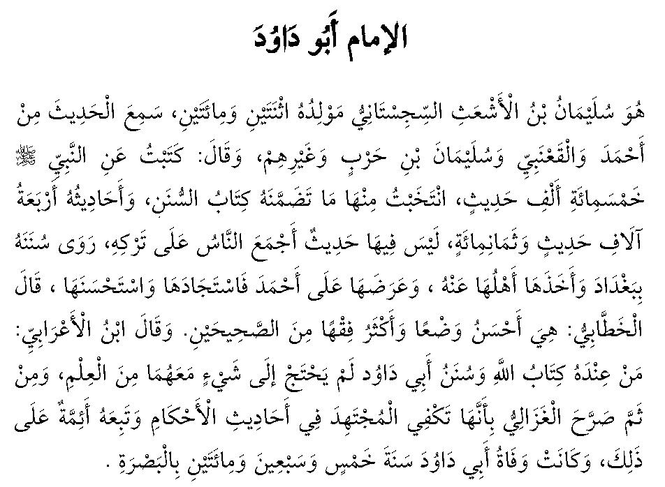Skaniyan so Sulayman bin al Ash’ath as Sijistaniy inimbawata’ ko ragon a 202 ko Hijriyyah, siombakan iyan so Hadith sii ko Imam Ahmad a go sii ko al Qa’nabi a go sii ko Sulayman bin Harb a go so salakaw kiran. Go pitharo’ iyan a: Inisorat akn a phoon ko Nabi so lima gatos nggibo a hadith, na miakapili’ ako ron sa so manga hadith a riankom skaniyan o manga kitab a hadith, go so manga hadith iyan na pat nggibo a go walo gatos a hadith. Da a matatago’ on a hadith a ba kiaompongi ko manga ulama ko hadith so kimbagakn on. Pianothol iyan so manga hadith iyan sii sa Baghdad, a go ron, na kinowa on o manga taw ankoto a manga hadith iyan. Inidayag iyan ko Imam Ahmad ankoto a manga hadith iyan na iniitong iyan sa mapiya. Pitharo’ o al Khattabi a: Skaniyan oto na manga hadith a lbi a mapiya i btad, a go mala’ a kitotompok iyan ko fiqhi a di so dowa a Sahih. Pitharo’ o Ibn al A’rabiy a: Sa taw a matatago’ on so Qur’an a go so kitab o Abu Daud na da’ a maphangindaw niyan a nganin a pd ko kata’o. Misabap roo na biathk o al Gazali a: Mataan a skaniyan a kitab na khaamplan iyan so taw a Mujtahid sii ko manga hadith a kokoman, sa inonotan skaniyan roo a sabaad a manga imam. Miaadn so kiawafat o Abu Daud a sii ko ragon a 275 Hijriyyah sii sa al Basrah.