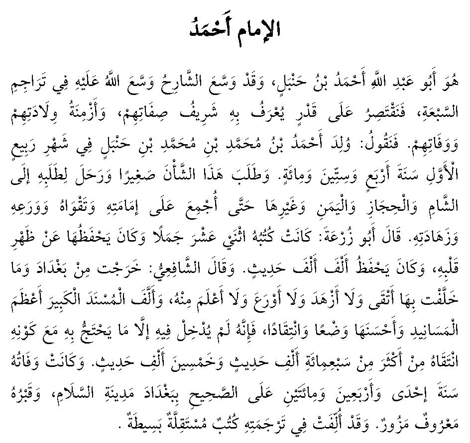 Skaniyan so Abū Abdillāh Ahmad bin Hanbal, sabnar a piakablang o miosay sa piakaloagan skaniyan o Allāh (سُبْحَانَهُ وَتَعَالَى) sii ko osayan ko pito a Imām, na aya zanaan tano na so diyanka’ a khakilala on so kaporo’o manga sipat iran, a go so manga masa o kinimbabawataan kiran a go so kiapa-ngawawafat iran. Sa ptharoon ami a: Inimbawata’ so Ahmad bin Mohammad bin Muhammad bin Hanbal sii ko olanolan a Rabīil Awwal ko ragon a 164 Hijriyyah. Pianontot iyan so kata’o ko kaito’ iyan pn a go minda-lakaw ko kiasombak iyan sa kata’o sii sa Shām a go sa al Hijāz a go sa al Yaman a go so salakaw ron kiaopakatan so kaiimam iyan a go so kalk iyan ko Allāh (سُبْحَانَهُ وَتَعَالَى) a go so kasanggila niyan a go so katatawaranga niyan ko doniya. Pitharo’ o Abū Zur’ah a: Miaadn so manga kitab a sapolo’ a go dowa a bkhs sa miaadn skaniyan a milalahar iyan sii ko poso’ iyan, miaadn skaniyan a makalalahar sa nggibo nggibo a hadith. Pitharo’ o as Shāfiī a: Miawa’ a ko sa Baghdād na da’ a kiaganatan akn on a mama a lbi a mala’ i kalk ko Allāh (سُبْحَانَهُ وَتَعَالَى) a go da’ a lbi ron a tomatawarang ko doniya a go da’ a lbi ron a masanggila’ a go da’ a lbi ron a mala’ i kata’o a ba niyan kalawani so Imām Ahmad. Madakl a manga kitab a inisorat pantag ko kiapagintaw niyan.