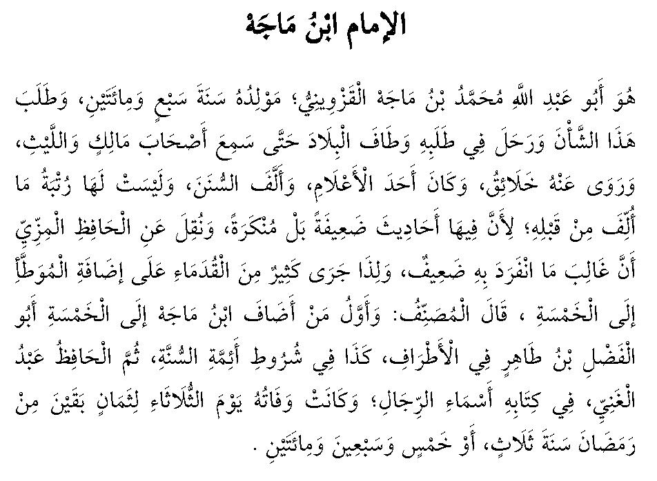 Skaniyan so Abu Abdullah Mohammad bin Majah al Qazwini, inimbawata’ ko ragon a 207 ko Hijriyyah, sa piganad iyan so kata’o ko Hadith sa mindalakaw ko manga darpa’ ko kiapaganda niyan on, sa liniyot iyan so manga ingd sa taman sa miakasombak ko manga bolayoka o Imam Malik a go so Imam al Layth a go madakl a taw a miamanothol sa hadith a phoon on, sa miaadn skaniyan a isa ko manga ala’ a ulama sii sa doniya, sa inisorat iyan so kitab a as Sunan, sa da a pankat iyan ko manga kitab a inisorat ko onaan iyan, ka kagiya adn a madadalm ko kitab iyan a manga hadith a malobay a go adn pn a masasanka’ on. Go minitogalin a phoon ko Alim a so al Hafidh al Mizziy a aya kon a kalilid ko manga hadith a skaniyan bo’ i mianothol on na malobay, sabap roo, na aya inokitan o miangaoona a manga ulama na so khipagomann iran ko kitab a al Muwatta’ sii ko lima a manga kitab,. Pitharo’ o mizorat a: Aya paganay a taw a inioman iyan so Ibn Majah sii ko lima a miamanorat sa hadith na so Abu al Fadhl bin Tahir, sii ko kitab iyan a al Atraf, sa datar oto sii ko manga sarat o manga imam ko Hadith (sunnah) oriyan oto na so al Hafidh Abdulgani, sii ko kitab iyan a: Asma’ ar Rijal. Aya kiawafat iyan na sii ko alongan a Salasa a walo gawii a da kapopos o bolan a Ramadhan, a ragon a 275 Hijriyyah.