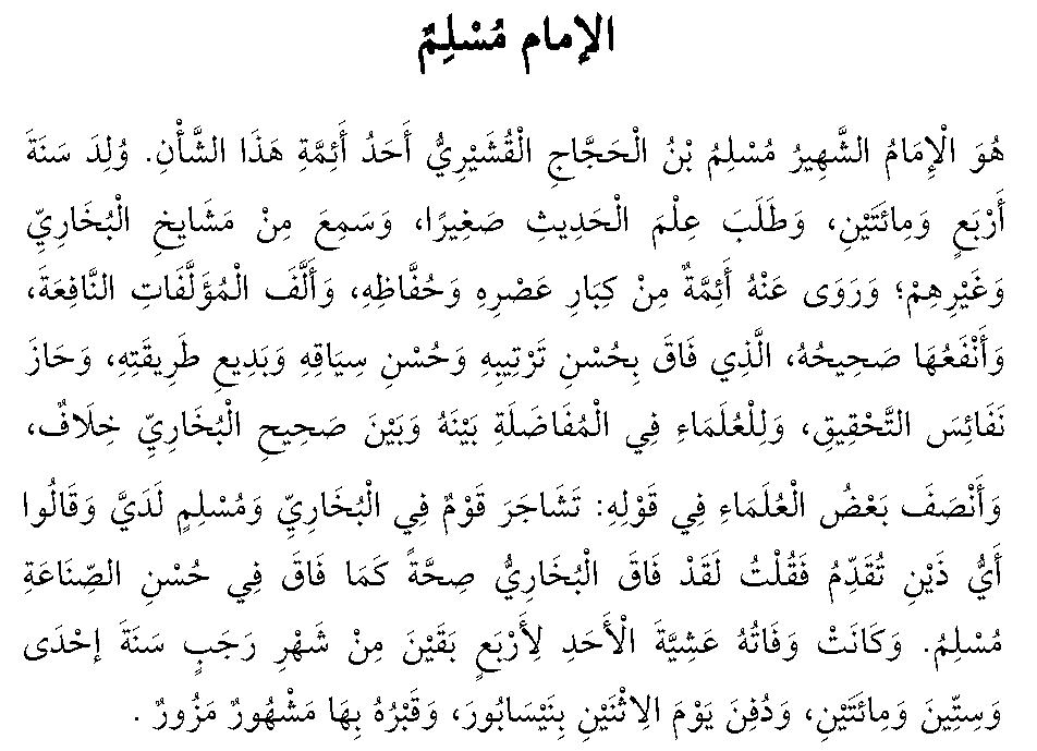 Skaniyan so Imām a lomalankap so thotholan on a so Muslim bin al Hajāj al Qushayrī a isa ko Imām ko hadith. Inimbawata’ skaniyan ko ragon a 204, pithontot iyan so kata’o ko hadith ko kaito’ iyan pn, go miamakin’g sa kata’o ko manga shayk o al Bukhārī a go so salakaw ron, sa miamanothol a phoon on a manga imām a pd ko manga ala’ ko masa niyan a go so manga taw a lomalahar on, sa inipanorat iyan so manga kirtab a phakanggay a gona, a aya lbi ron a mala’ i gona na so kitab iyan a Sahīh a so miakalawan sabap ko kapiya o kiaatora on a go so kapiya a lapiyat iyan a go so kataid o lalan iyan, sa miakhipantag iyan so manga ala’ i gona ko kiatankda on, go rk o manga ulama sii ko kapakaplbiyaa on a go so Sahīh al Bukhārī a kiasobag, sa miaginontolan so sabagi’ ko manga ulama sii ko katharo’ iyan a: Miaphapawala’ a pagtaw sii ko al Bukhārī a go so Muslim sii rakn, sa pitharo’ iran a anda sanka’i a dowa a imām i phakaonaan ami? na pitharo’ akn a sabnar a miaona so al Bukhārī si ko kasasahih (kapipiya) o kitab iyan, sa datar oto a miaona so Muslim sii ko kapiya o kinibtadn iyan ko kitab iyan. Miawafat skaniyan ko kagabinan ko gawii a Ahad a pat gawii a mialamba’ ko gawii o olanolan a Rajab ko ragon a 261, sa inilbng ko gawii a Isnin sii sa ingd a Naysabūr, sa so kobor iyan na matatago’ roo a phlawiin o manga taw.