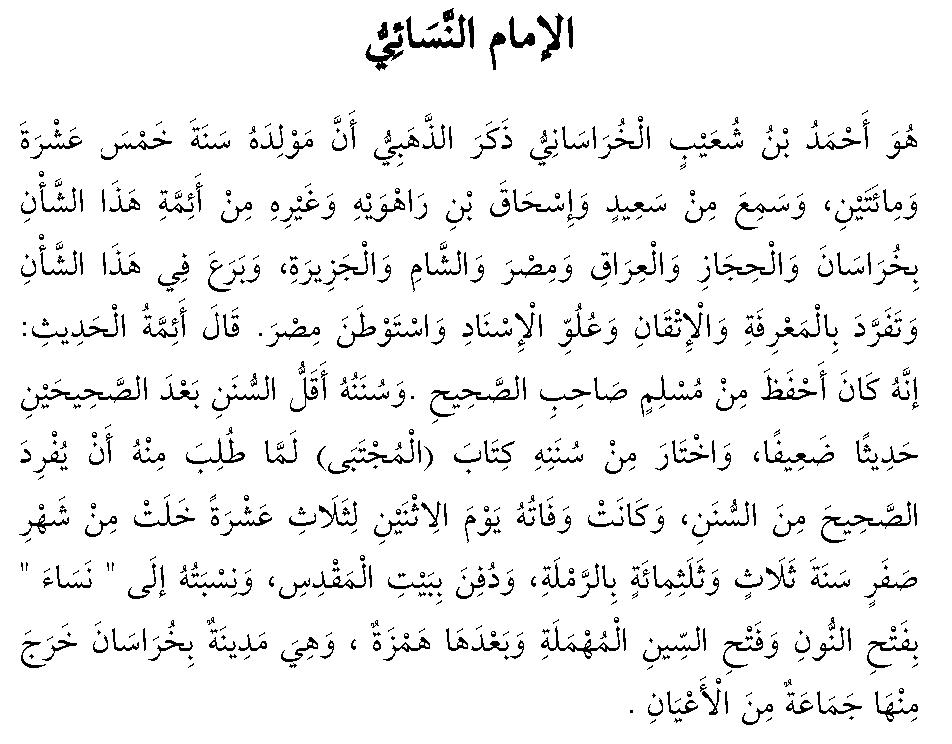 Skaniyan so Ahmad bin Shu’ayb al Khurasani, inaloy o ad Dahabi a so kinimbawataan on na sii ko ragon a 215 hijriyyah. Miakasombak ko hadith sii ko Said, Ishaq bin Ruhwayhi a go so salakaw ron a pd ko manga imam sii ko hadith sii sa Khursan, a go sa al Hijaz, a go so Iraq a go sa Misir a go sa al Jazirah. Lomiawan skaniyan sii sankanan a kata’o ko hadith a go mimbisa ko kata’o ron a go so kiaimpid on a go so kaporo o kapkhasanday o manga hadith, sa miagingd skaniyan sii sa Misir. Pitharo’ o manga Imam ko hadith a: Mataan a skaniyan na lbi a mapasang i kalahar a di si Muslim a khirk ko Sahih. So kitab iyan a Sunan na aya minos ko manga kitab a sunan ko oriyan o dowa a sahih i kapakararankom sa hadith a malobay. Pinii’ iyan sii ko Sunan iyan so kitab a al Mujtaba gowani a pangnin on sa isibay niyan so manga hadith a sahih sa mablag ko kitab a sunan. Miaadn so kiawafat iyan a sii ko gawii a Isnin a sapolo’ a go tlo gawii a miaipos ko olanolan a Safar a ragon a 303 ko Hijriyyah sii sa ingd a ar Ramlah sa inilbng sakaniyan sii sa Bayt al Maqdis. Sii skaniyan babangnsaan sa ingd a Nasa’ a skaniyan na bandaran sii sa ingd a Khurasan a kiambowatan a sabaad a manga ala a ulama.