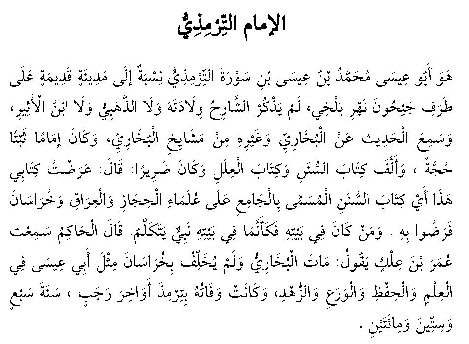 Skaniyan so Abu Isa Mohammad bin Isa bin Sawrah at Tirmidi ibabangnsa sii sa Bandaran a andang sii ko poro’ o ingd a Jayhun a lawasaig a balkhiy. Da’ maaloy o mianothol on so gawii a kinimbawataan on, da pn so ad Dahabi go da’ pn so Ibn al Athir o ba iran oto miapanothol. Kiasombakan iyan so Hadith sii ko al Bukhari a go so salakaw ron a pd ko manga shaykh o al Bukhari. Miaadn skaniyan a imam a kominal a tanda’ ko kata’o ko agama. Inisorat iyan so kitab a sosoratan ko manga hadith (kitab as sunan) a go so kitab a al Ilal, sa miaadn skaniyan a di phakanono (bota). Pitharo’ iyan a: Inidolon akn so kitab akn, giyoto so kitab iyan a sunan a pmbthowan sa al Jami’ sii ko manga ulama sa Hijaz, a go sa Iraq a go sa Khurasan na miaso’at siran on. Go sa taw a maadn skaniyan (a at Tirmidi) sii ko walay niyan na datar o ba so walay niyan na kadadalman sa Nabi a giitharo’. Pitharo’ o al Hakim a mian’g akn so Umar bin Ilk a gii niyan tharo’on a: Miawafat so al Bukhari na da’ a minibagak iyan sii sa Khurasan a ba datar o Abu Isa sii ko kata’o, a go so kalahar a go so kapananggila sa dosa. Miaadn so kiawafat iyan a sii sa ingd Tirmid ko kaposan ko Rajab ko ragon a 267.